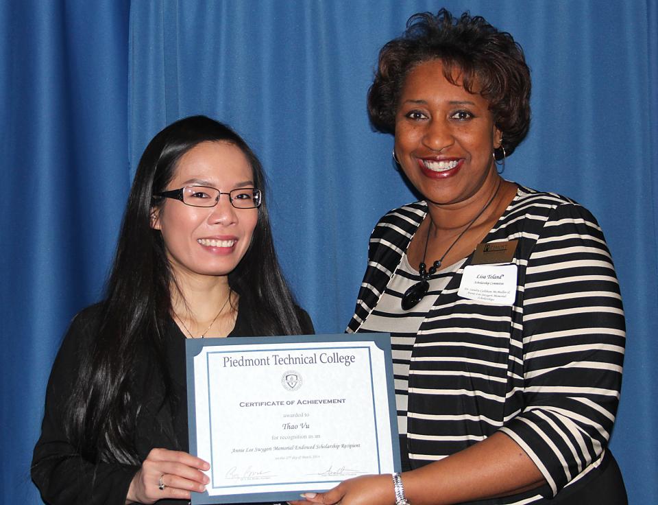 Two Piedmont Technical College students were recently awarded the Annie Lee Swygert Scholarship. Thao Vu (left), a pre-nursing student from Abbeville, is congratulated by Lisa Toland, scholarship committee member. Not pictured is Marian Grier, a pharmacy technology student from Donalds. The scholarship is awarded each year based on academic achievement and financial need to a South Carolina resident.