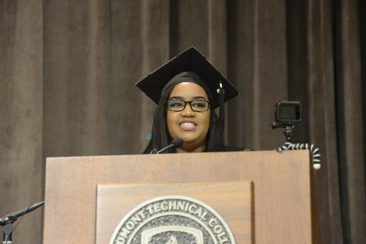 “I realized that I wanted to help people feel safe and be a helping hand,” she told her fellow graduates. “I am excited to continue on to work part time with WCTEL. … During that time, I will be returning to Piedmont Tech in the spring to complete my Human Resources Certificate. I also plan to get higher certifications in Human Resources.”
