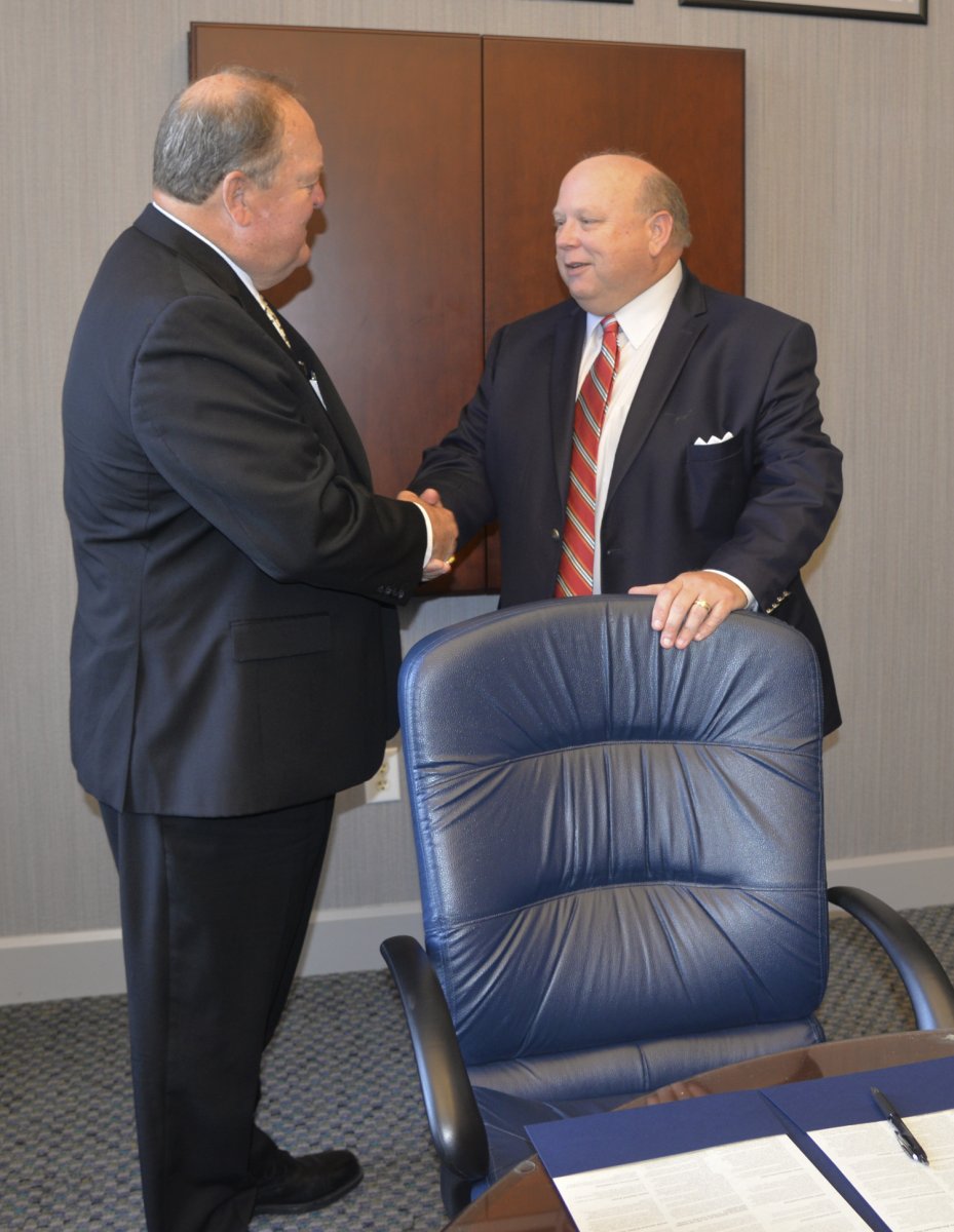 - Dr. Brooks (left) and Dr. Whitaker shake hands.